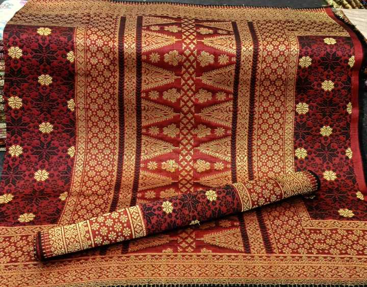 Kemudian, pengrajin mulai menenun benang emas atau perak ke dalam kain dengan alat tradisional yang disebut gedogan. Proses ini tidak hanya memerlukan keterampilan teknis, tetapi juga kesabaran dan intuisi seni tinggi. Pola songket biasanya mengikuti motif tradisional seperti naga besaung, bunga teratai, pucuk rebung, atau tampuk manggis, yang masing-masing memiliki makna filosofis mendalam mulai dari simbol kekuatan, kemakmuran, hingga kesucian.
